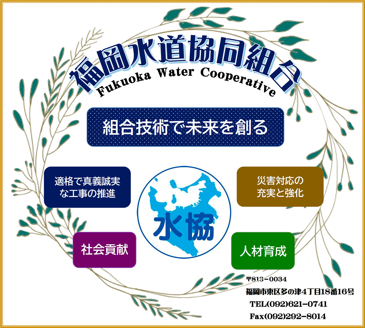 当組合は、平成27年11月に発足し、本年で創立9年を迎えるまだまだ成長過程の組合ですが、福岡市水道局が掲げる「将来にわたり安全で良質な水道水の安定供給」という目標達成のパートナー業界として、使命責務の一端を果たしてまいりたいと考えております。